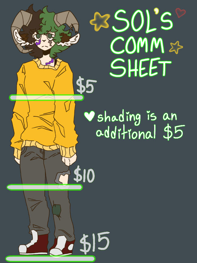 i currently have art commissions open ! as shown above , that is my pricing ! to see more in depth info on my commissions + my tos and other stuff , check out this carrd !